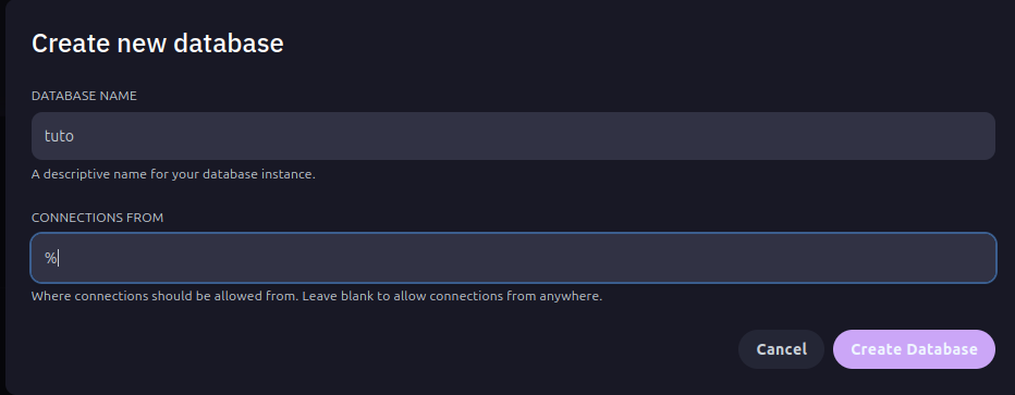 Puis ensuite en cliquant sur create Database vous aurez les informations nécéssaires !